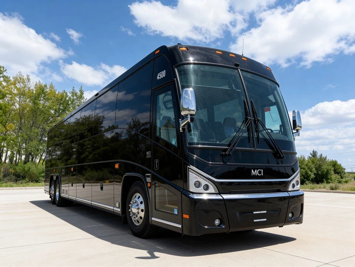 This full-size charter bus seats up to 50 passengers and includes reclining seats, WiFi, power outlets, restrooms, and undercarriage luggage bays. It's ideal for school trips, sports tournaments, or long-distance travel.